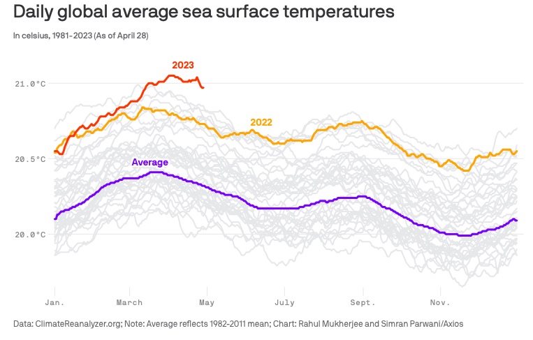 Why it matters: Hotter oceans are hugely consequential for land areas, since they can contribute to more frequent and severe extreme weather and climate events, from deluges to heat waves.