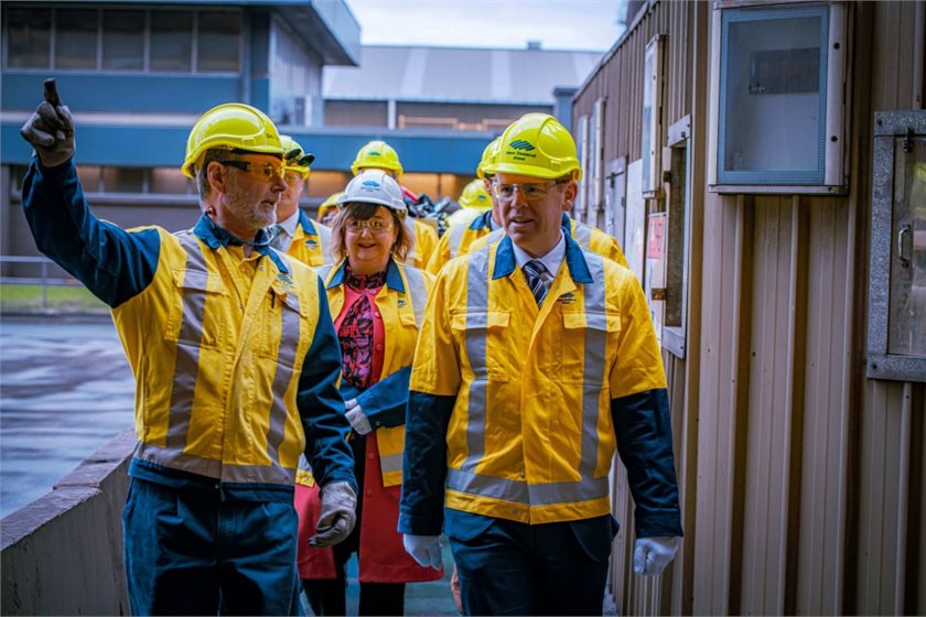 | PHOTO: Minister of Energy and Resources Megan Woods and Prime Minister Chris Hipkins on site at NZ Steel in Glenbrook, Auckland. Source: NZ Steel. |