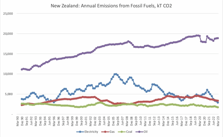 Partial data for the first quarter of 2023 just released by the Ministry of Business, Innovation, and Employment, shows that emissions from oil, gas, and coal are down 3%, 26%, and 29% respectively after peaking in 2019, with the percentage of generation from renewables reaching the high 90s.