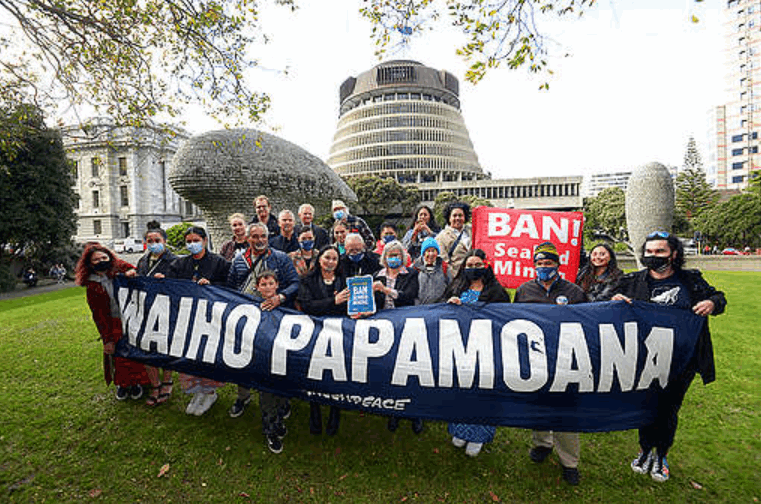 | Te Paati Māori co-leader Debbie Ngarewa-Packer (centre) championed a members bill to ban seabed mining, which was voted down in May. IMAGE: Greenpeace |