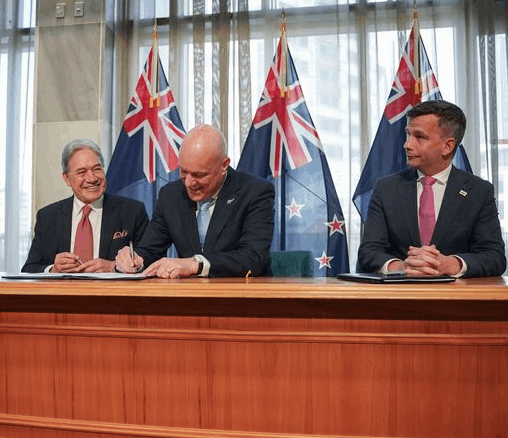 | NZ First leader Winston Peters, National leader Christopher Luxon, and ACT leader David Seymour signed coalition agreements on Friday. |