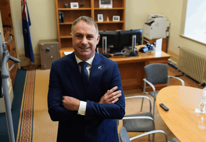 | Climate change minister Simon Watts in his new Beehive office. |