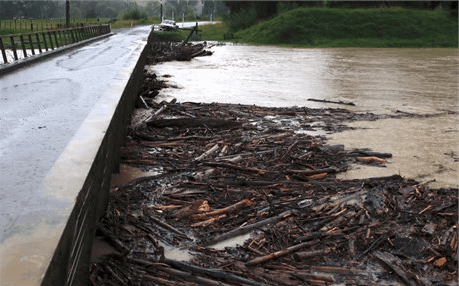| Forestry slash and flooding on Wigan Bridge, Tolaga Bay |