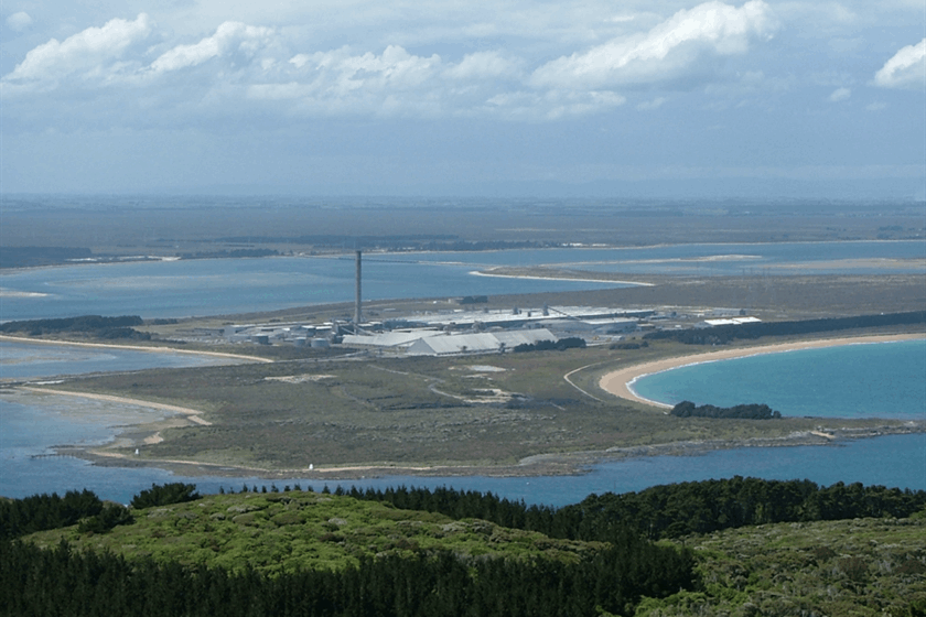 | Tiwai Point aluminium smelter. PHOTO: Wikimedia CC BY 2.5 |