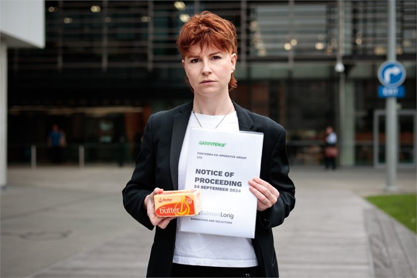Greenpeace's Sinéad Deighton-O'Flynn, serving dairy company Fonterra with a lawsuit, in Auckland on Monday. PHOTO: Greenpeace |