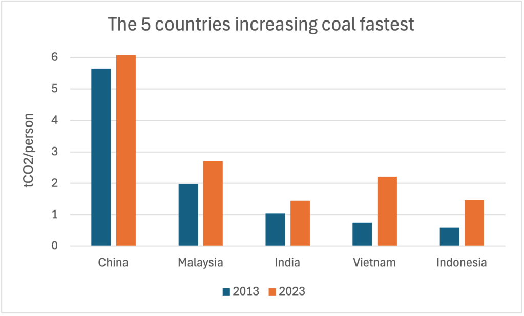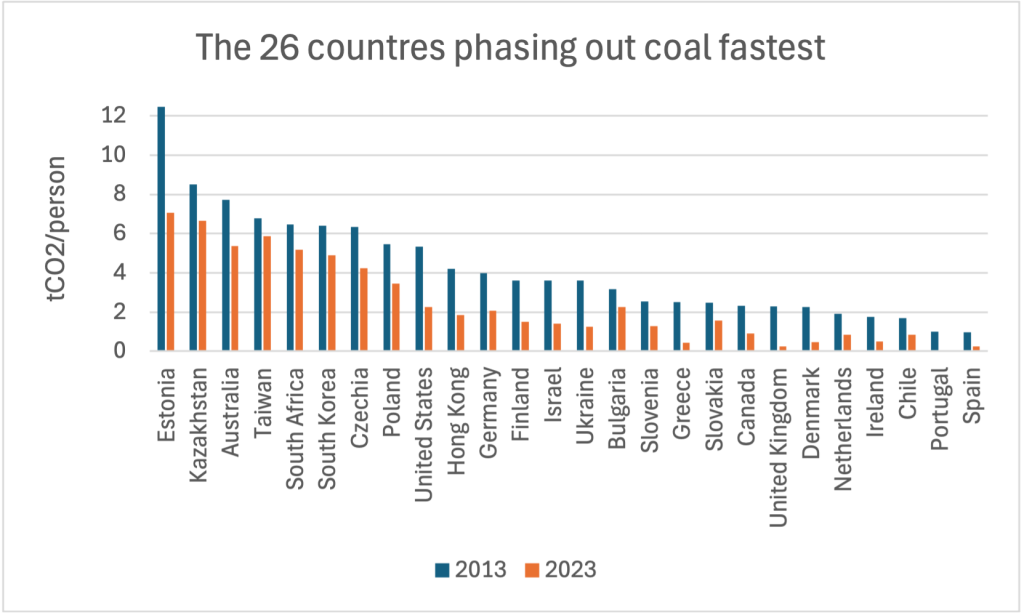 For most of these countries, the phase out was twice as fast in 2018-2023 as in 2013-2018 – a dramatic acceleration. The 26 countries reduced coal emissions by an average of 0.18 tCO2/person every year for a decade.