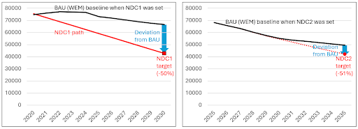 | Figure 3: The methodology change from a budget in NDC1 to a single-year target in NDC2 allows emissions to be higher than if a budget approach had consistently been applied. |