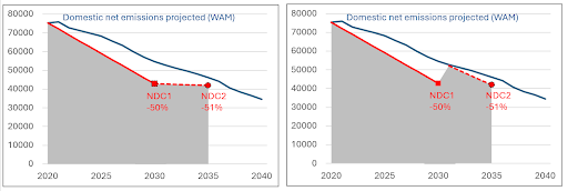 However, the intended NDC path actually looks like the picture on the right of Figure 3 (for a 51% NDC2): the government’s intention is for emissions to track from 2030 domestic emissions (blue) down to the target level in 2035. That means that allowed emissions go up in 2031 from the 2030 target level, and be higher than that 2030 target level in every year during the implementation period until just squeaking in with a slight reduction compared to 2030 in the 2035 target year. That allows around 24Mt of extra emissions than if emissions were held at the 2030 target level.