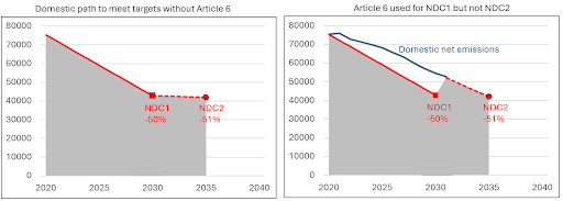 | Figure 4: As shown on the right, use of Article 6 in NDC1 only allows 2030 emissions to be higher than the target level, causing cumulative emissions to be higher across the two NDC periods. |