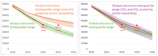 However the New Zealand government does not consider this a fair comparison, given New Zealand’s high share of livestock methane emissions. They instead calculated a rescaled global-equivalent pathway, scaling a percentage reduction in New Zealand’s AFOLU, waste, and fossil methane emissions at the corresponding global sectoral decline rates, while scaling New Zealand’s other emissions by gas at the global rate for those gases. The output is shown in orange in the left graph in Figure 5. Compared to the orange range, NDC2 looks reasonably ambitious.