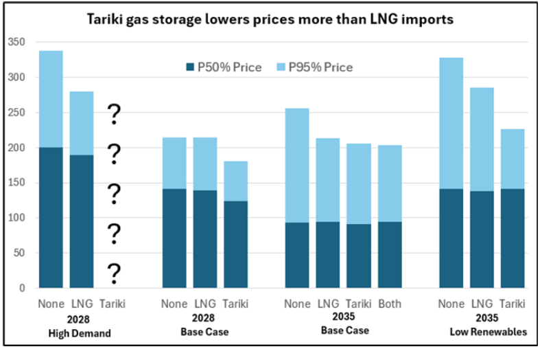 The modelling shows that developing the Tariki gas storage facility lowers electricity prices more than the government's LNG plan. The Tariki project being developed by Genesis Energy and partners would provide up to 10PJ of storage, which is a similar magnitude to the government’s sizing of 12PJ of LNG needed in a dry winter.