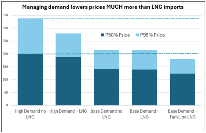 Comparing the “High Demand” and “Base Case” scenarios, lowering demand reduces both median and dry-year prices more than twice as much as achieved by the subsidised LNG. As a rough estimate, even if you could only save half the demand difference between the high and baseline scenarios, it would still come out better than LNG.