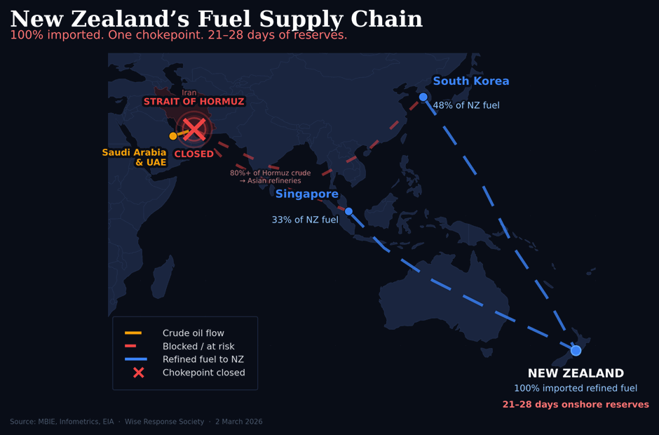Third, that New Zealand sits in a uniquely exposed position: no domestic refining, 21 days of diesel reserves, complete dependence on maritime supply chains through contested chokepoints, and an agricultural export economy that runs on diesel from paddock to port.