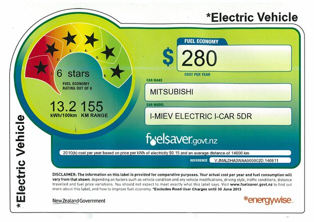 A new energy-efficiency label for cars has been launched in Wellington, and it puts the average annual cost of driving the Mitsubishi i-MiEV at $280 – equal to paying 26 cents a litre for petrol.
