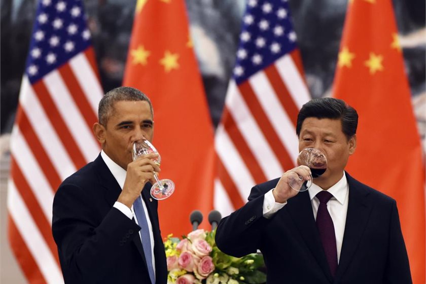US President Barack Obama and Chinese President Xi Jinping raise a glass to their surprise announcement on climate change. Reuters pic |